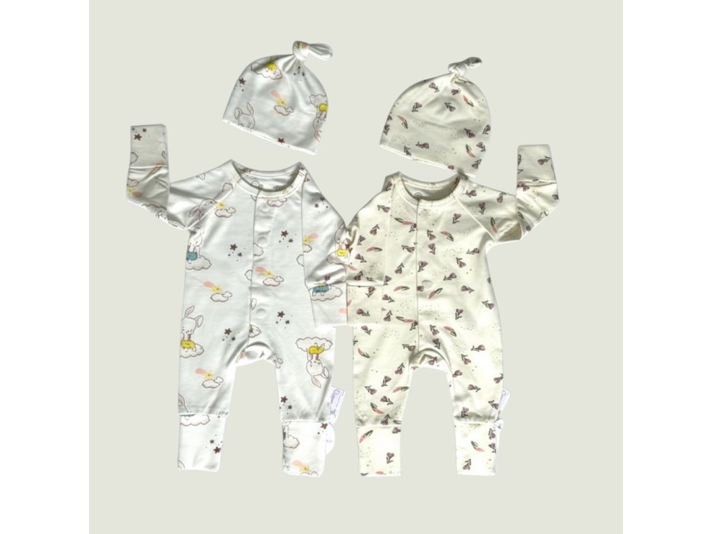 Set obsahuje 2 rastúce dupačky a 2 uzlíkové čiapky vo veľkosti 0–3 mesiace.