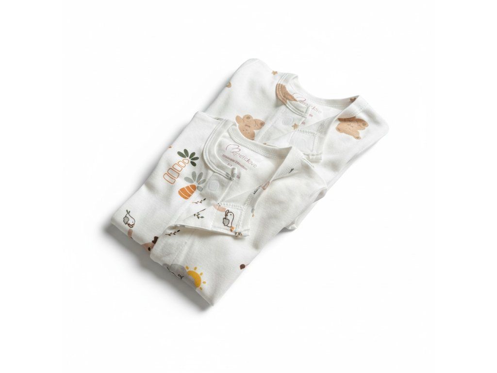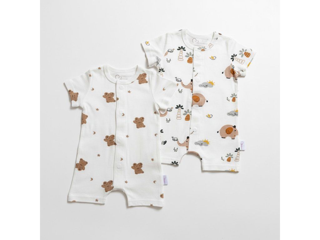 Set dvoch bambusových letných dupačiek s magnetickým zapínaním – Sloník a Maco. Praktická kombinácia dvoch vzorov pre každodenné pohodlie bábätka.