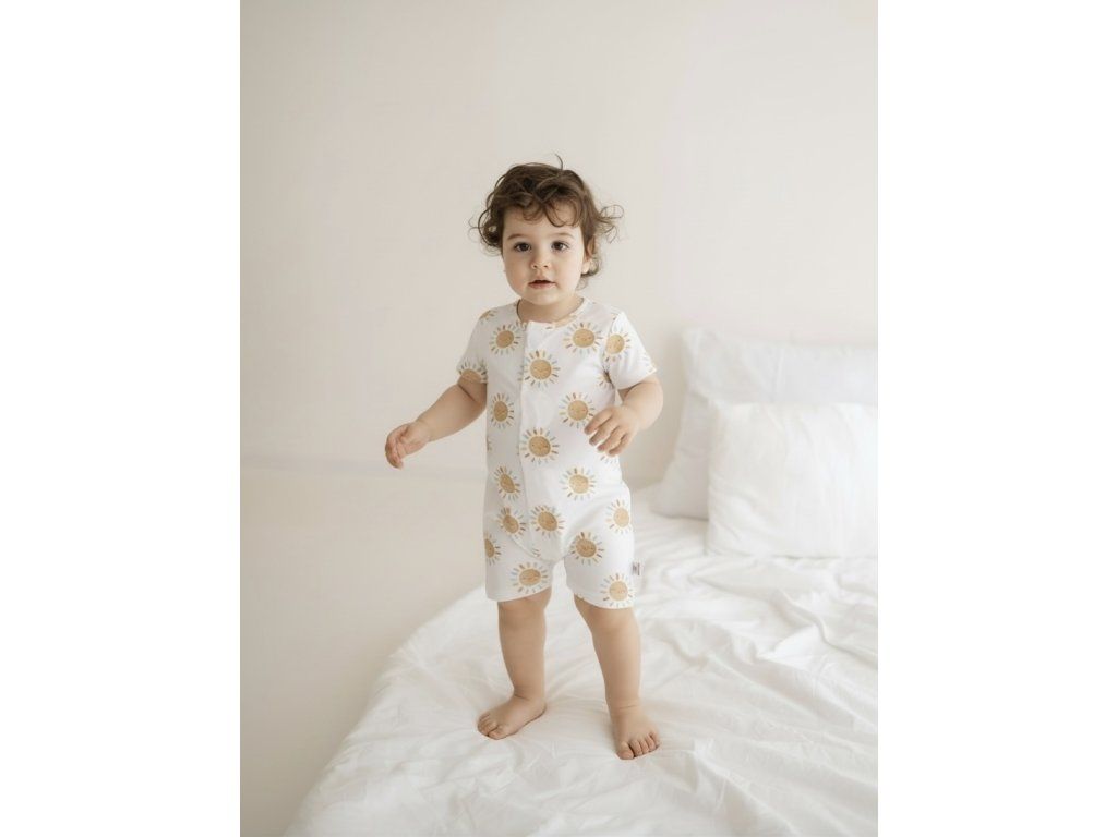 Soft bamboo romper with magnetic fastening, ideal for warm days and comfortable sleep. Breathable, lightweight and naturally temperature-regulating.