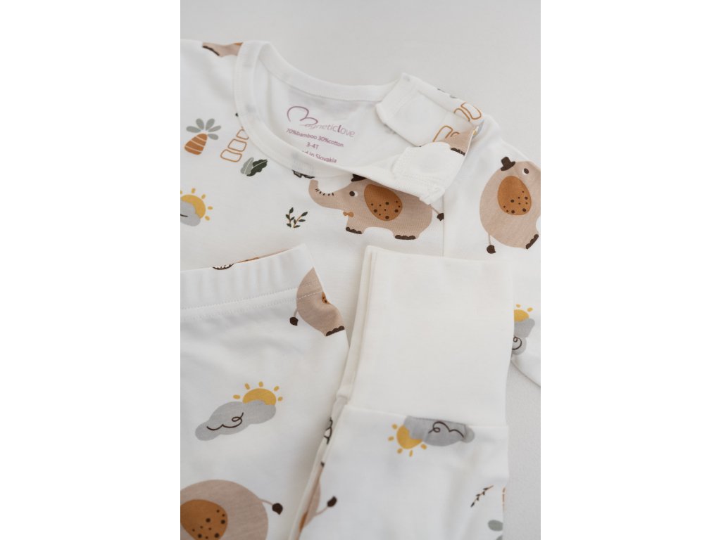 Dvojdielne rastúce pyžamo navrhnuté tak, aby rástlo spolu s dieťaťom vďaka nastaviteľným patentom. Magnetické zapínanie pri krku uľahčuje prezliekanie. Vyrobené z kvalitného materiálu (95 % bavlna, 5 % spandex), ktorý je jemný, priedušný a pohodlný na spánok.